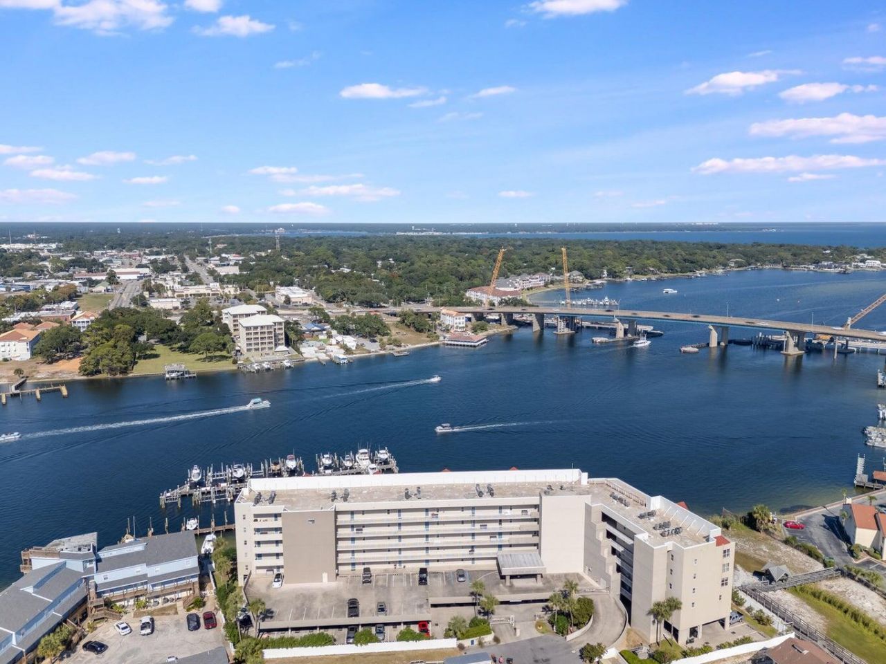 Amazing new lower price and spectacular views of the Santa Rosa Sound, Intracoastal Waterway, Brooks Bridge, and Palm Court Yacht Club. Great opportunity to own a waterfront condo INCLUDING a boatslip and all the resort amenities. Enjoy the breezes on your private balcony, watching the boats float by and all the other sights and sounds of waterfront living. This condo unit is uniquely positioned in the development to provide upper floor views with parking right out your front door. And Palm Court Yacht Club is uniquely positioned to provide adjacent boardwalk access from the Palm Court pool directly to the Gulf by way of the Blue Dolphin Beach Access. This condo unit is ready for your updates and decorator touch so set an appointment soon to come take a look!